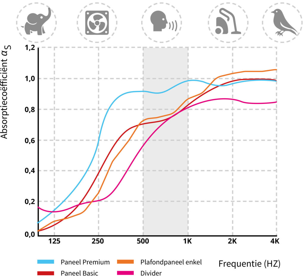 Onze akoestische panelen dragen bij aan een verbeterde akoestiek. Dit werkt als volgt: de absorptiewaarde geeft aan hoeveel geluid wordt geabsorbeerd. Deze waarde is verdeeld tussen de 0 en 1 en wordt met de α-waarde aangeduid. Een α-waarde van 0 betekent dat er geen geluidsoplossingen aanwezig zijn in de ruimte en het dus heel erg galmt, bijvoorbeeld zoals in een tunnel. Een α-waarde van 1 is daarentegen de beste waarde, waarbij er geen geluid meer is. Je kunt het vergelijken met een open raam waarin al het geluid verdwijnt. Dit is bijvoorbeeld in een muziekstudio vaak het geval.